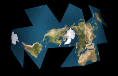 The Dymaxion Map is the only flat map of the entire surface of the Earth which reveals our planet as one island in one ocean, without any visually obvious distortion of the relative shapes and sizes of the land areas, and without splitting any continents.